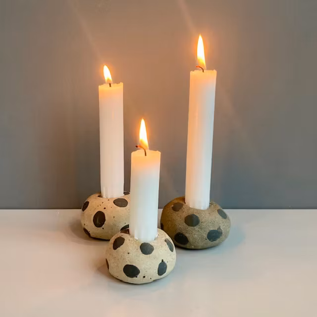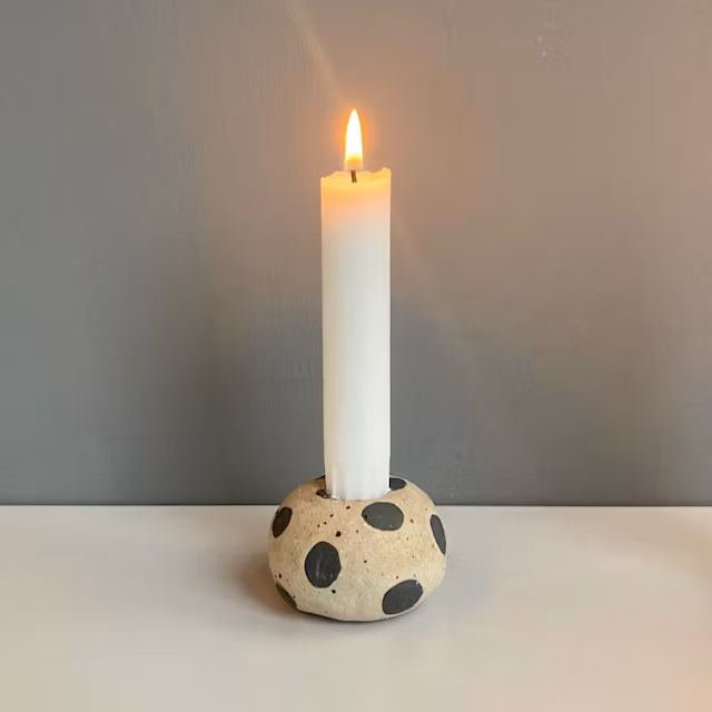 Ljusstake i stengodslera med lavafläckar.