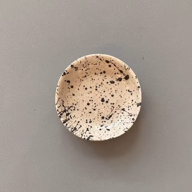 Liten skål i stengodslera med lavafläckar.