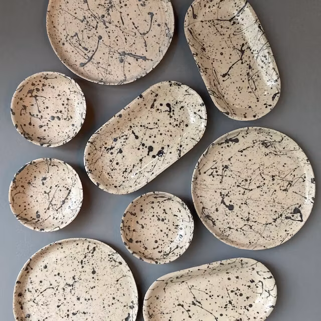 Liten skål i stengodslera med lavafläckar.
