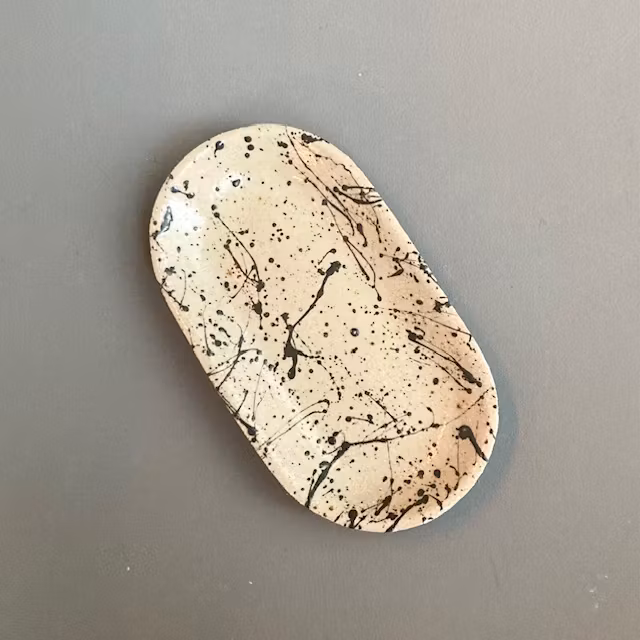 Fat i stengodslera med lavafläckar.