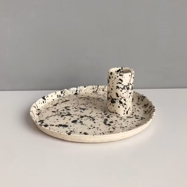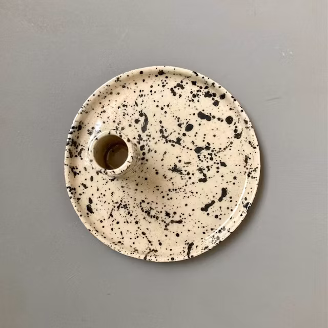 Ljusstake i stengodslera med lavafläckar.